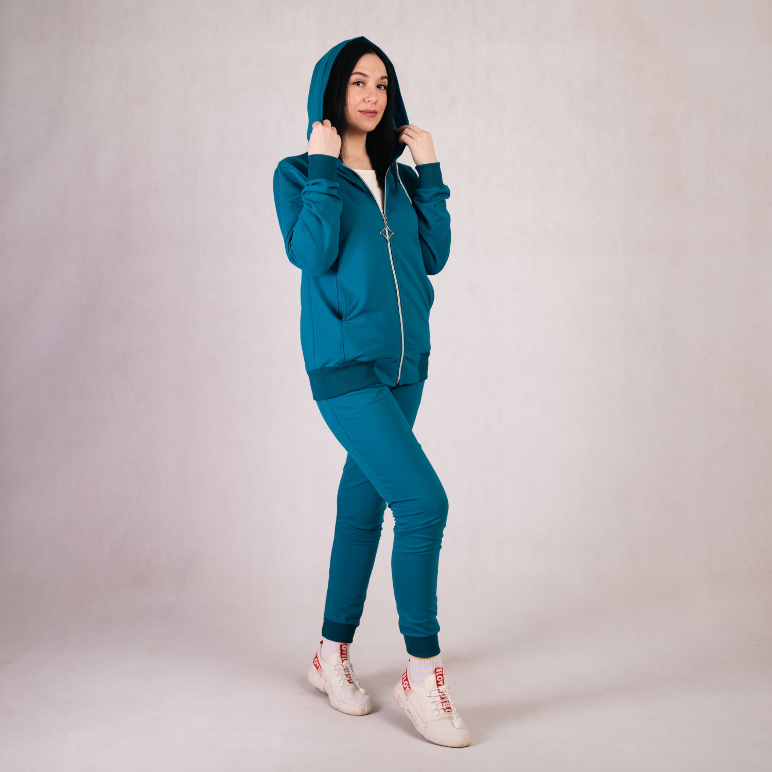 Молодіжний жіночий спортивний костюм 2-х нитка , кофта з капюшоном та на блискавці, штани з кишенями, полотно бавовна - (90% бавовни + 10% еластану).На фото дівчина в 44-ом розмірі.