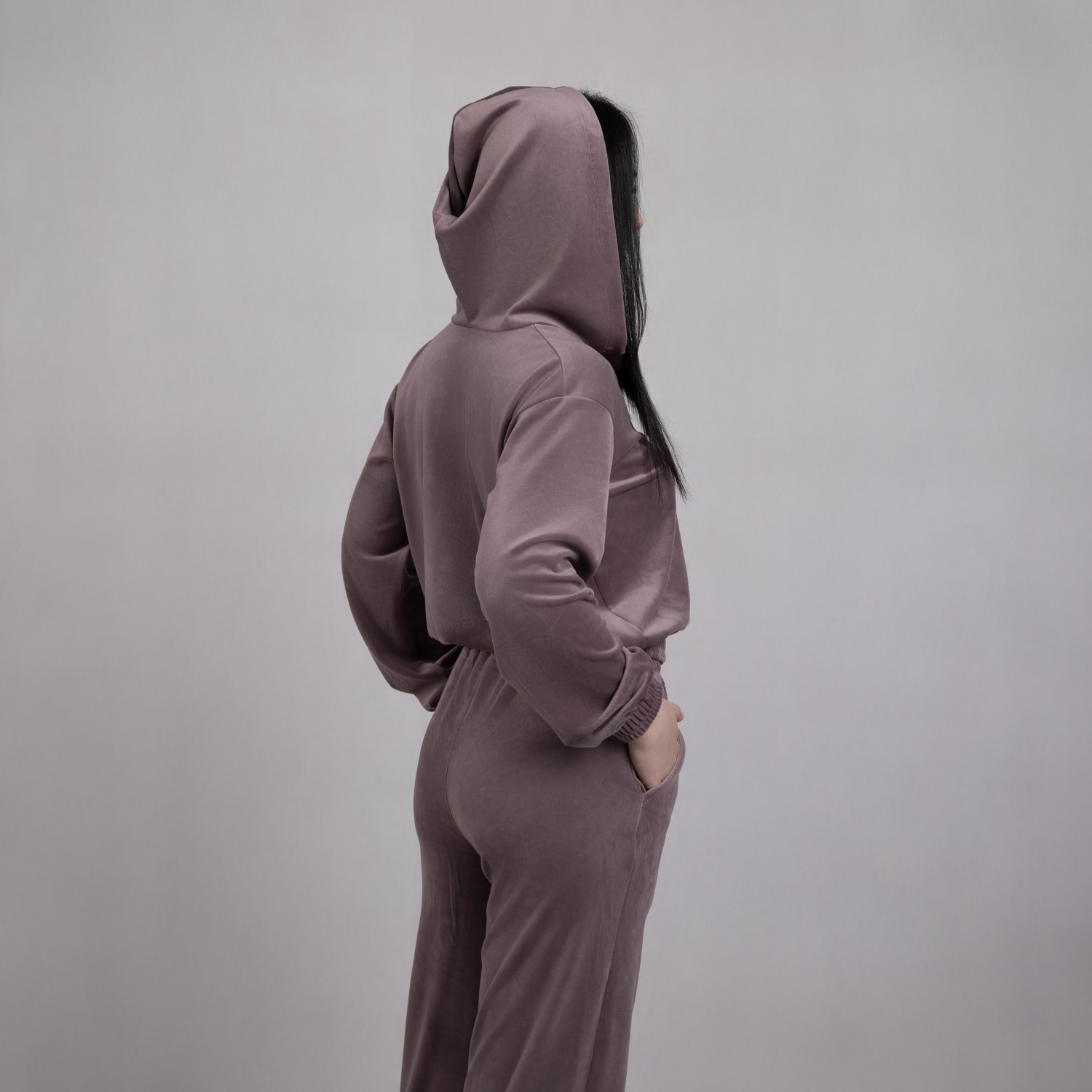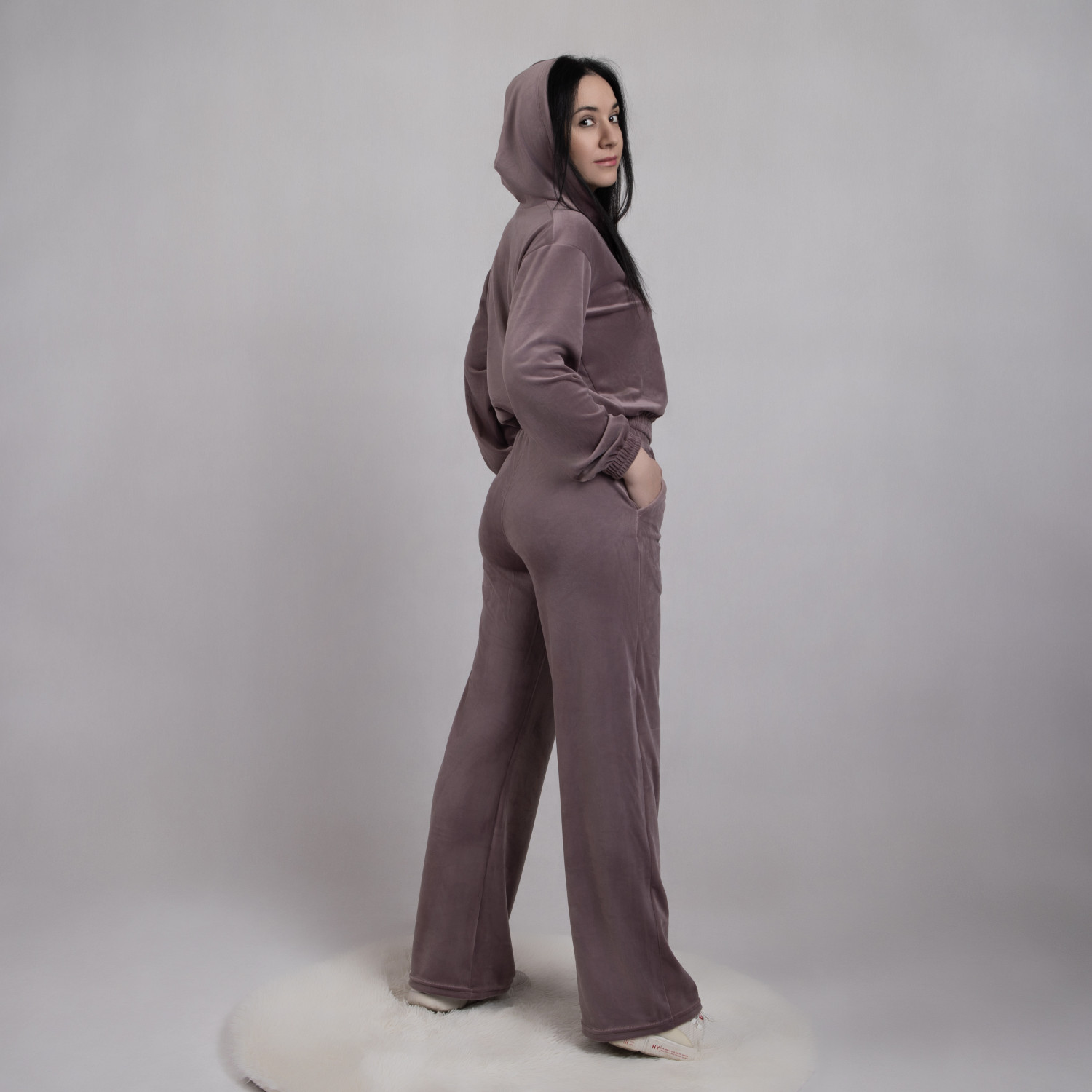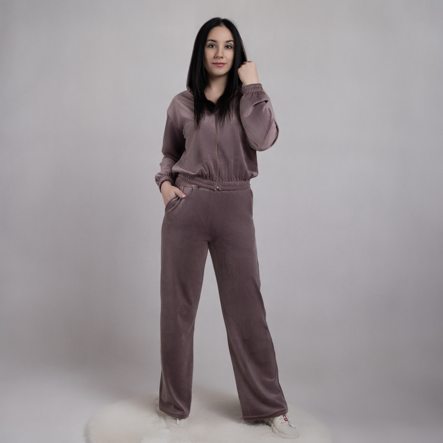 Молодежный женский спортивный костюм, кофта с капюшоном, штаны с карманами, полотно костюма турецкий велюр на хб основе (90% хлопка + 10% эластана).На фото девушка в 46-ом размере.