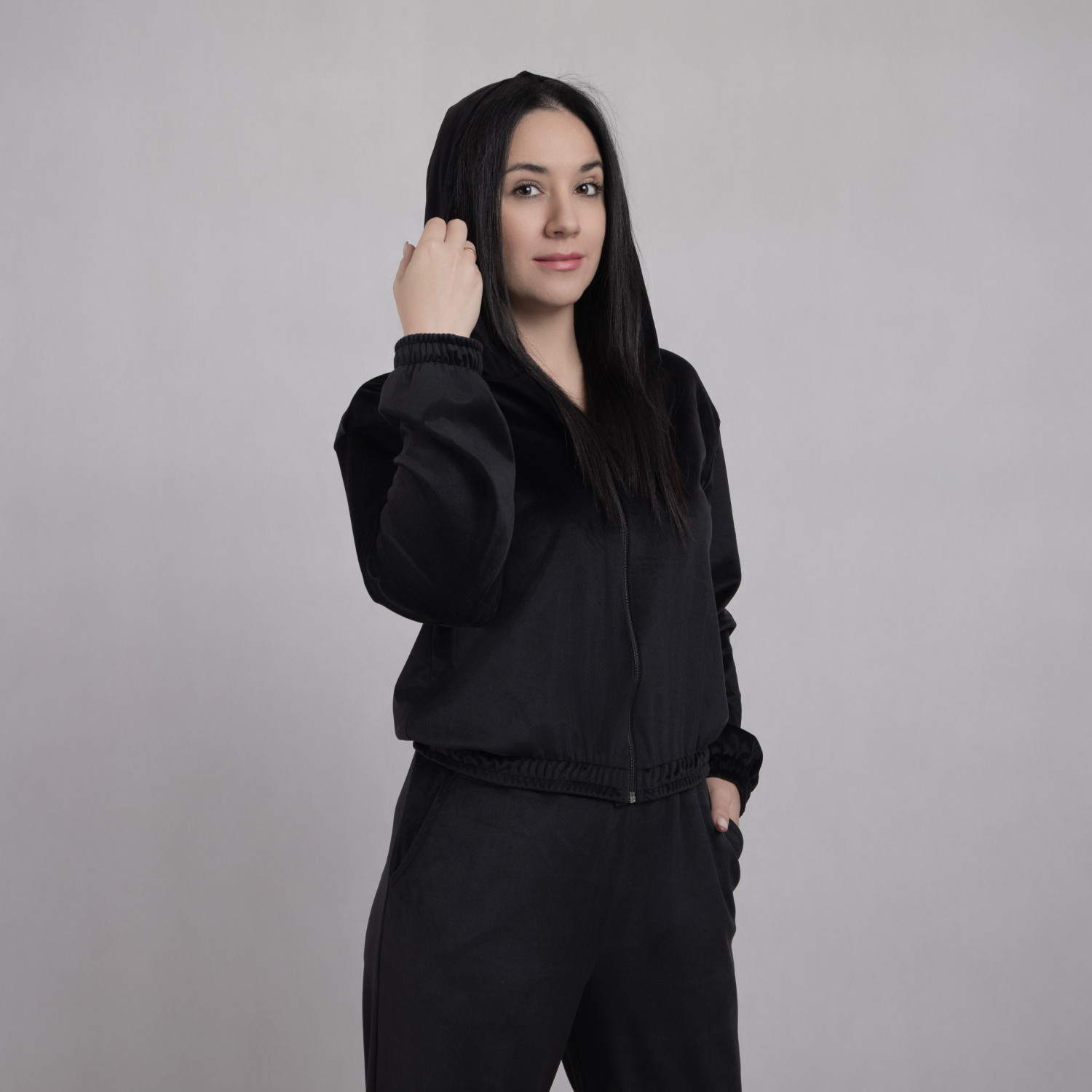 Молодежный женский спортивный костюм, кофта с капюшоном, штаны с карманами, полотно костюма турецкий велюр на хб основе (90% хлопка + 10% эластана).На фото девушка в 46-ом размере.