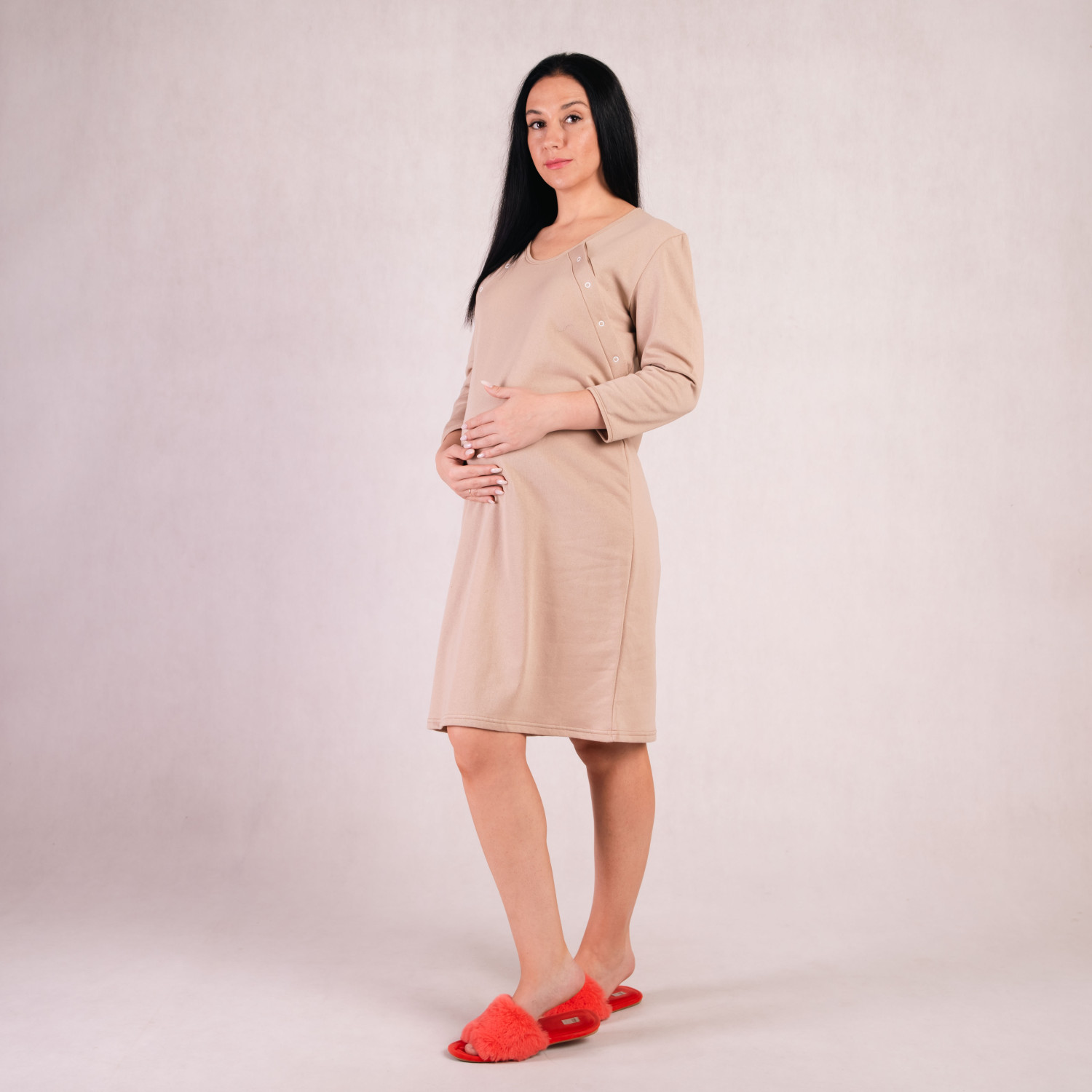 Теплая Ночная сорочка для кормящих мам на кнопках "Мишель бежевый цвет"46-54р.