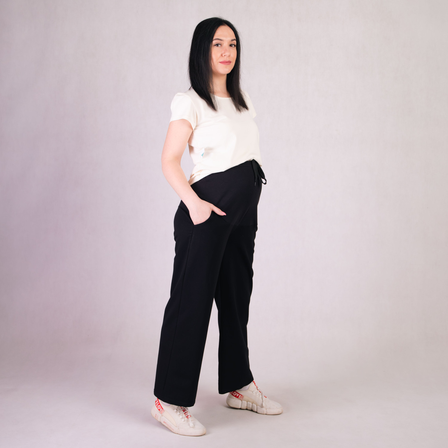 Женские штаны из качественного полотна, турецкая 2-х нитка (90% + 10% эластана). Штаны с карманами к низу расширены. Модель разработана специально для беременных.
